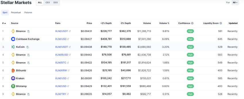 Berikut adalah snapshot dari pasar perdagangan spot, dengan pasangan XLM-USDT memegang sebagian besar dari volumenya. Perhatikan bahwa sebagian besar bursa kripto punya skor likuiditas yang baik untuk Stellar Lumens.
