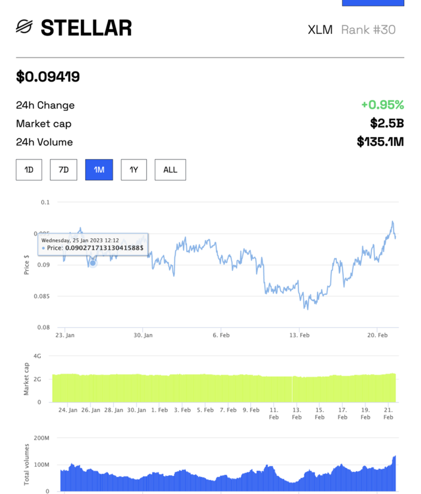 Kita juga akan menilai potensi investasi XLM atau Stellar Lumens—native crypto dari jaringan Stellar. Pada tanggal 22 Februari 2023, Stellar Lumens (XLM) diperdagangkan dengan diskon hampir 90% dari level tertingginya sepanjang masa di US$0,9381. Jadi seperti apa masa depan Stellar? Mari kita cari tahu. Pastinya, akan jadi hal menarik untuk melihat bagaimana proyek kripto “Stellar” ini berkembang di masa depan.