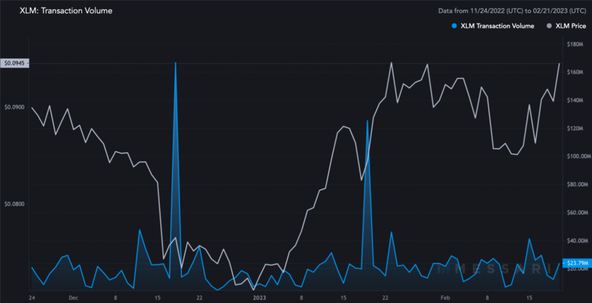 Sementara itu, volume transaksinya selama periode 3 bulan sama sekali tidak mendekati jumlah alamat aktif yang meningkat. Sebaliknya, grafiknya relatif mengecewakan, kecuali beberapa puncak pada Desember 2022 dan Januari 2023. Namun, puncak tersebut memang memainkan peran penting dalam memulai tren naik. Oleh karena itu, jika terjadi peningkatan aktivitas transaksi pada Stellar, kamu mungkin bisa mengharapkan kenaikan harga yang berkelanjutan.