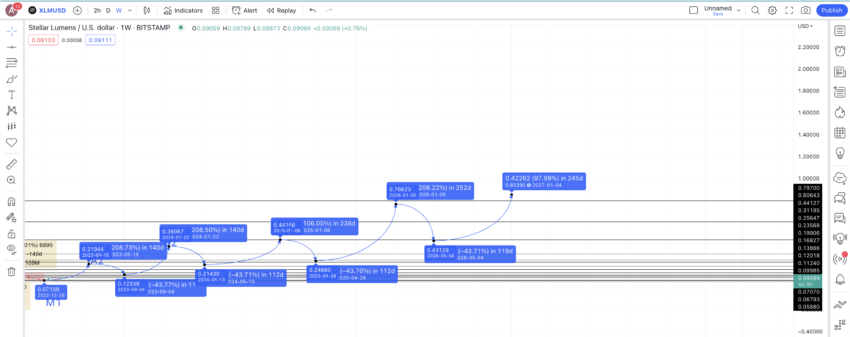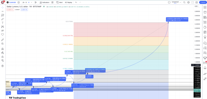 Sementara itu, dengan menggunakan ekstensi Fib, kita juga bisa menggunakan harga terendah di tahun 2026 dan harga tertinggi 2027 untuk memproyeksikan rute harga XLM hingga tahun 2030. Jika pola pertumbuhan yang sama tetap bertahan, kamu bisa memperkirakan prediksi harga Stellar untuk tahun 2030 akan muncul di level US$3,27.