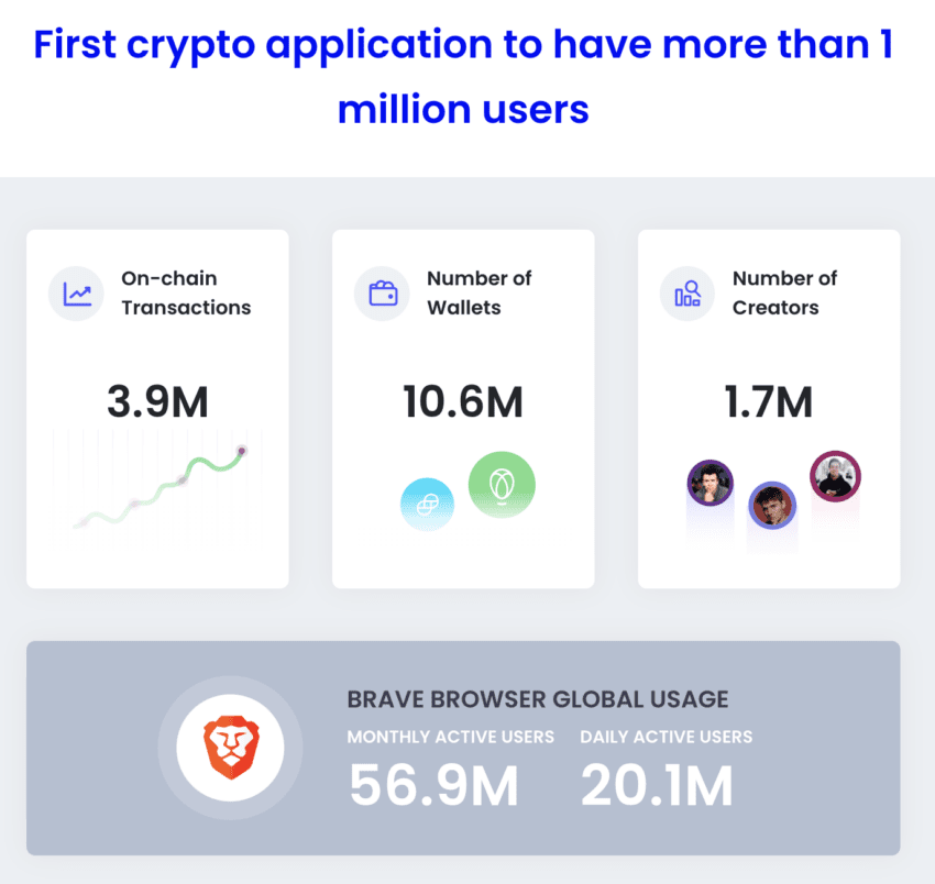 Per 3 Januari 2023, Brave sudah memiliki hampir 57 juta pengguna aktif setiap bulan dan 20,1 juta pengguna aktif setiap hari. Hampir 1,7 juta kreator berada di ekosistem BAT, dengan jumlah transaksi sudah mencapai 3,9 juta hingga saat ini.