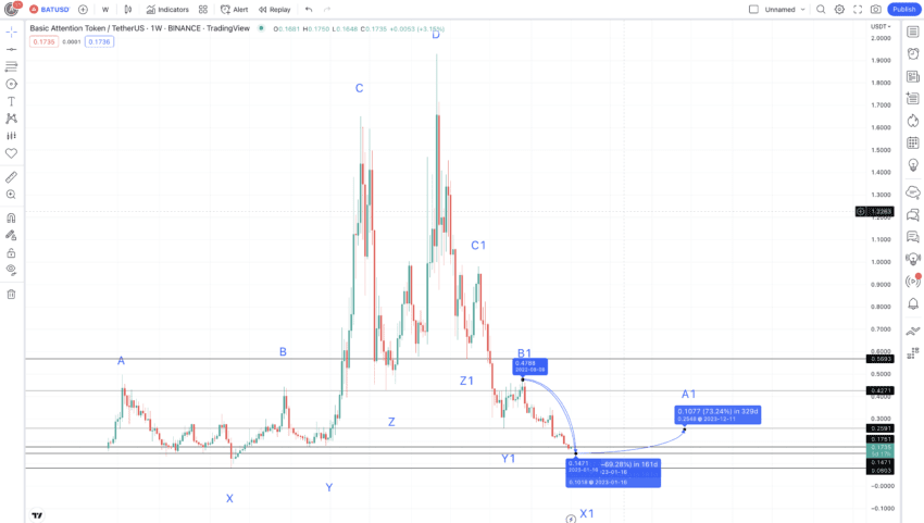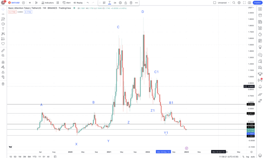 Meskipun penurunan aktual dapat menekan harga BAT ke level US$0,07, tapi pada tahun 2024, efek bear market mungkin sudah mulai mereda. Kita bisa melihat titik terendahnya mendapat support di level US$0,1751, yang berimpit dengan Y1 (salah satu zona support yang lebih kuat).