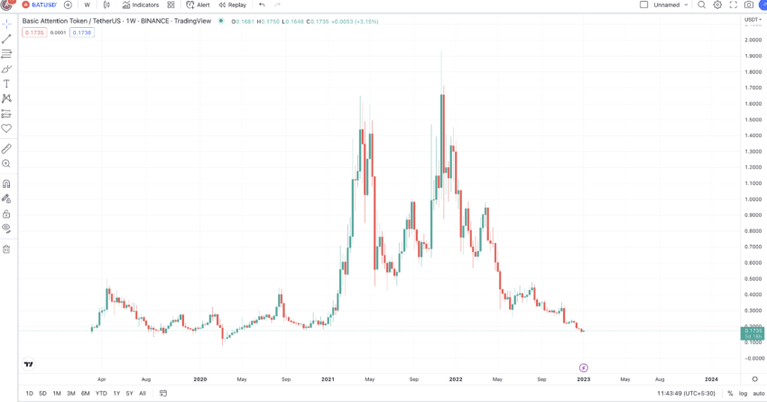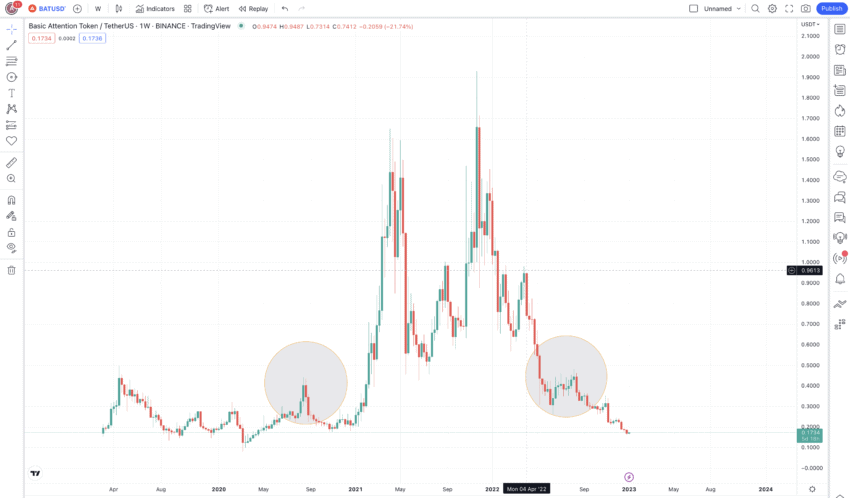 Aspek fundamental, informasi on-chain, dan tokenomics adalah parameter yang dapat diandalkan, tapi inilah saatnya untuk melihat grafik harga BAT untuk mengidentifikasi polanya.