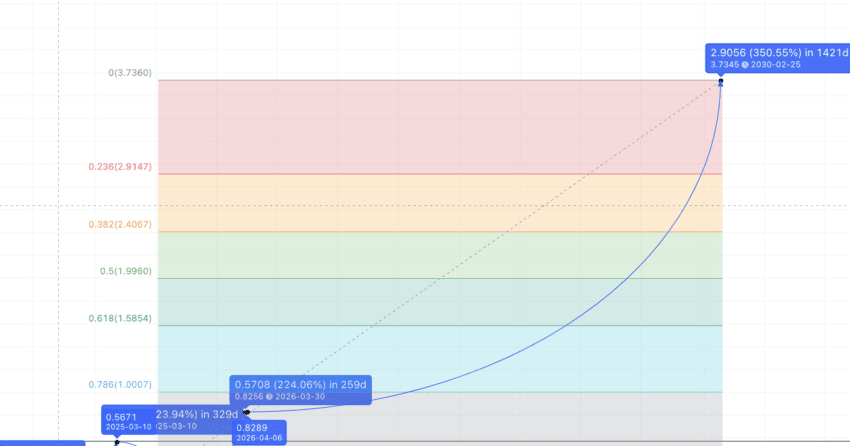 Jika kita menggunakan titik terendah tahun 2025 dan tertinggi tahun 2026 untuk menggambarkan level Fib, kita dapat melacak rutenya hingga tahun 2030. Berikut adalah bentuknya: