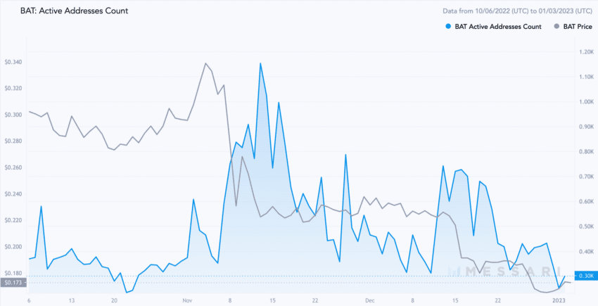 Jumlah alamat aktif proyek ini jelas telah turun selama tiga bulan terakhir. Grafiknya menunjukkan bahwa harga tertinggi memuncak pada awal November, ketika alamat aktif tumbuh pesat. Seiring penyebaran kontaminasi FTX (FTX contagion), jumlah alamat dan harga BAT ikut turun.