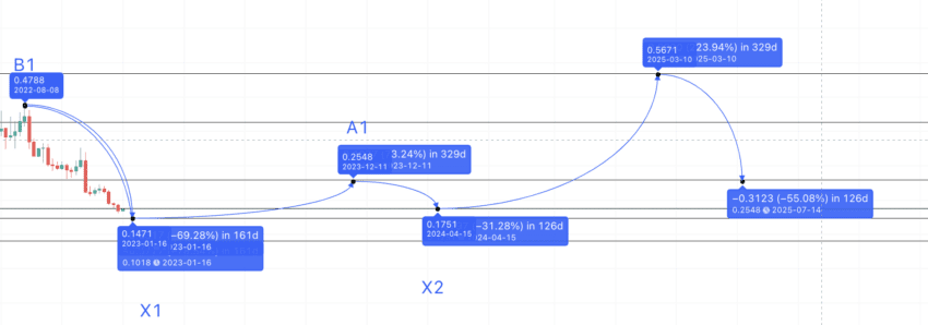 Sementara itu, dari A1, penurunan selanjutnya dapat terjadi dalam 127 hari (maks. 161 hari) dan sebesar -78,67%, menggunakan data tabel di atas. Kita dapat menandai titik terendah baru ini sebagai X2.