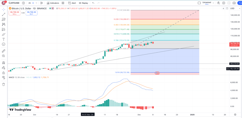 Sebelum kita menjelajahi analisis teknikal berbasis harga yang lebih luas, penting untuk melacak pandangan jangka pendek. Sekarang mari kita lihat grafik harian BTC/USDT per Desember 2024 dan telusuri lebih jauh: