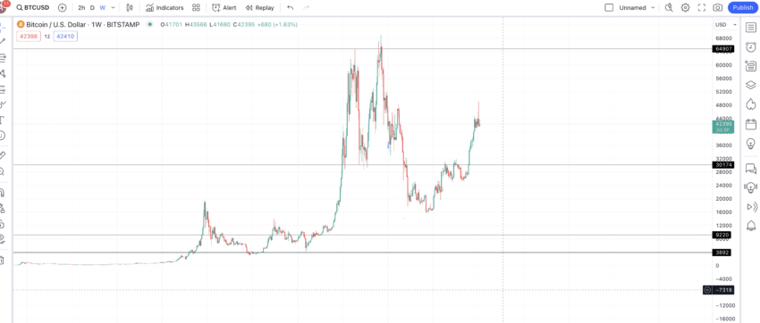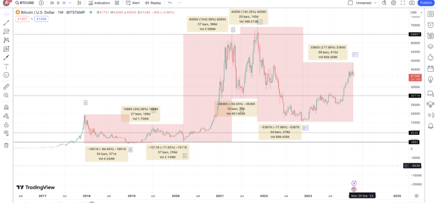 Kami menggunakan pola grafik sebelumnya untuk menemukan kemungkinan harga Bitcoin pada tahun 2024. Inilah yang kami simpulkan: