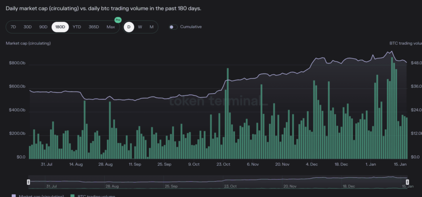Indikasi sinyal bullish lainnya adalah meningkatnya kapitalisasi pasar, sejalan dengan indikator volume perdagangan BTC. Grafik ini berasal dari awal tahun 2024.