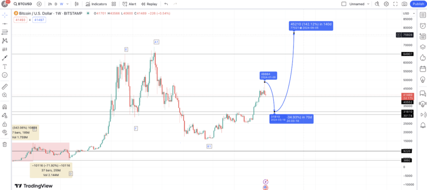 Jika melihat lebih dekat, kamu mungkin melihat tren serupa yang terbentuk dengan A1-B1-C1 yang sudah terbentuk. Rangkaian poin berikutnya adalah D1, E1, dan F1, yang dapat memberi kita perkiraan harga Bitcoin di masa depan.