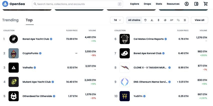 Berikut adalah statistik OpenSea dengan koleksi NFT bervolume teratas selama tujuh hari terakhir (pada saat publikasi). Perlu kita perhatikan bahwa ENS menempati urutan kesembilan dalam daftar tersebut. Selanjutnya, dalam daftar 30 hari, mereka menempati urutan ketujuh.