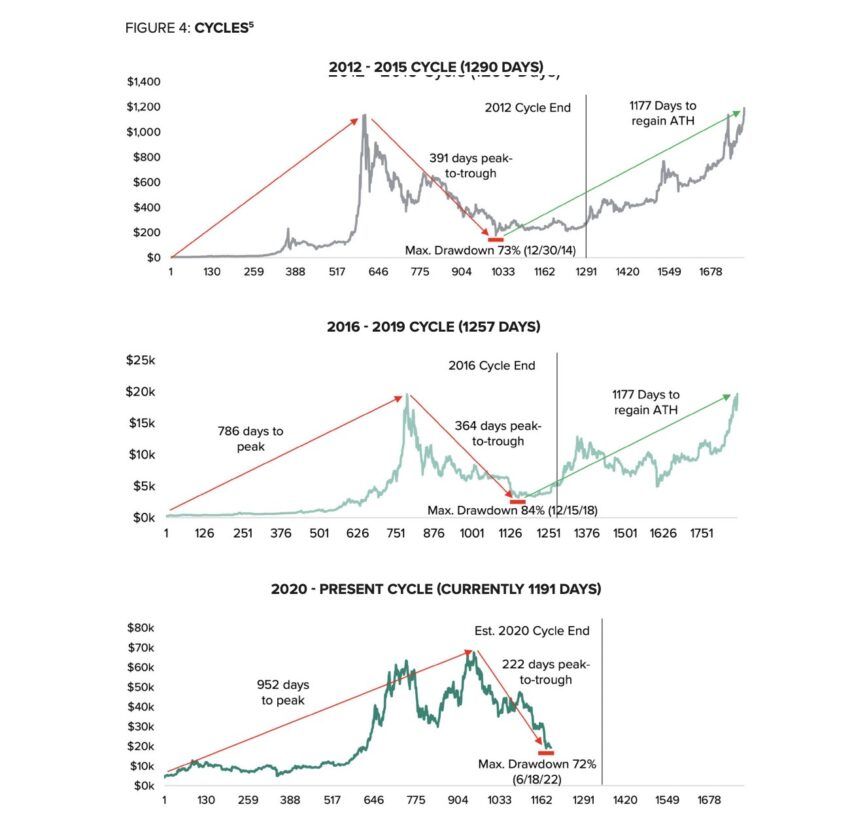 Pasa kripto bergerak sesuai dengan siklusnya. Berdasarkan grafik yang disediakan oleh Grayscale pada Juli 2022 ini, pasar masih punya waktu empat hingga enam bulan sebelum siklus bearish berakhir. Dengan begitu, kita bisa melihat pergerakan bear yang berangsur berakhir pada awal Januari atau Februari 2023.