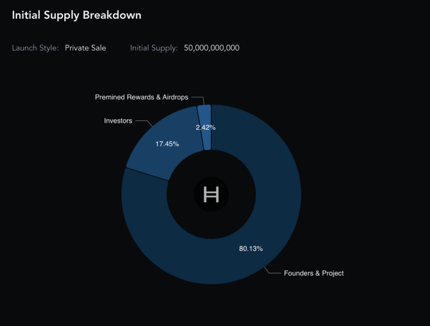 HBAR, token asli dari jaringan publik ini, memiliki batas pasokan 50 miliar. Grafik rincian pasokan awal menunjukkan bahwa alokasi untuk investor hanya 17,45%, sedangkan lebih dari 80% pasokan tetap milik pendiri/proyek.
