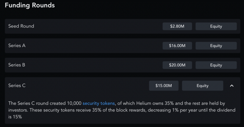 Selain itu, genesis block mainnet Helium telah memprogram rilis token untuk holder security token. Mereka juga mulai mendapatkan HNT setelah mainnet diluncurkan. Penjualan security token dimulai dengan seed round senilai US$2,80 juta.