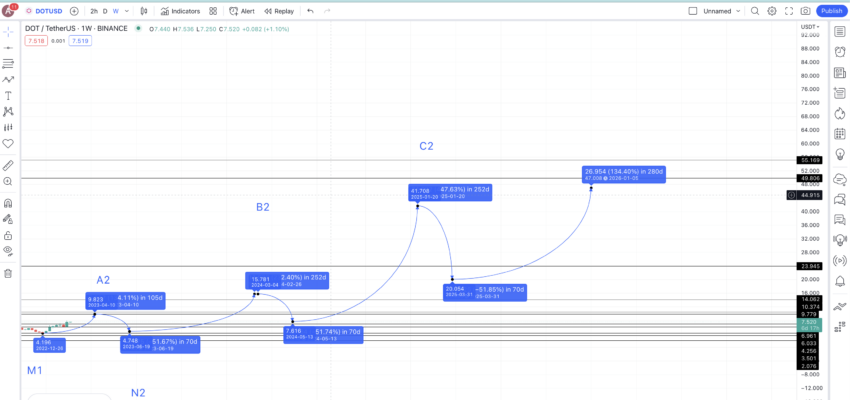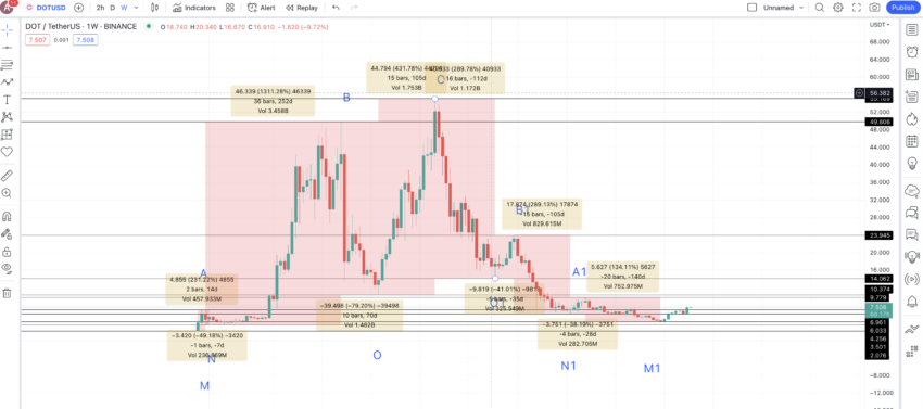 Meskipun prediksi ini bersifat jangka pendek, kita bisa memeriksa grafik harga DOT mingguan untuk melacak pergerakan harga jangka panjang dan mengidentifikasi pola yang jelas.