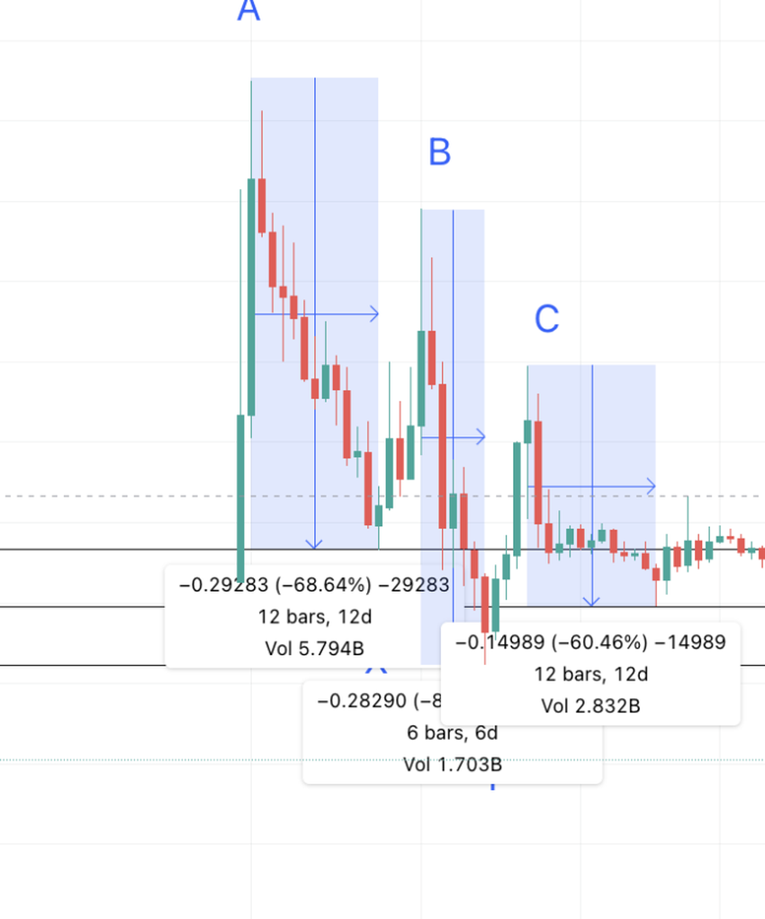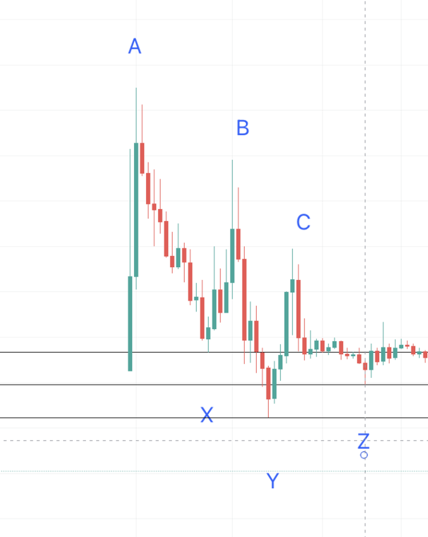 Garisnya muncul di US$0,0078, atau B yang baru. Sehingga, pada saat ini, kita dapat memprediksi adanya lower-high lainnya dan beberapa koreksi saat periode ini. Namun, setelah titik B, kita juga bisa memprediksi titik C.