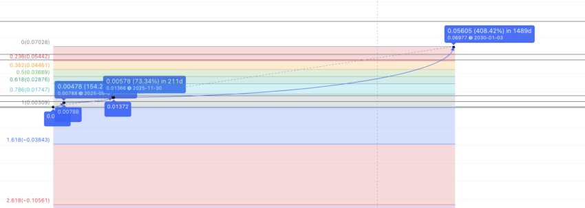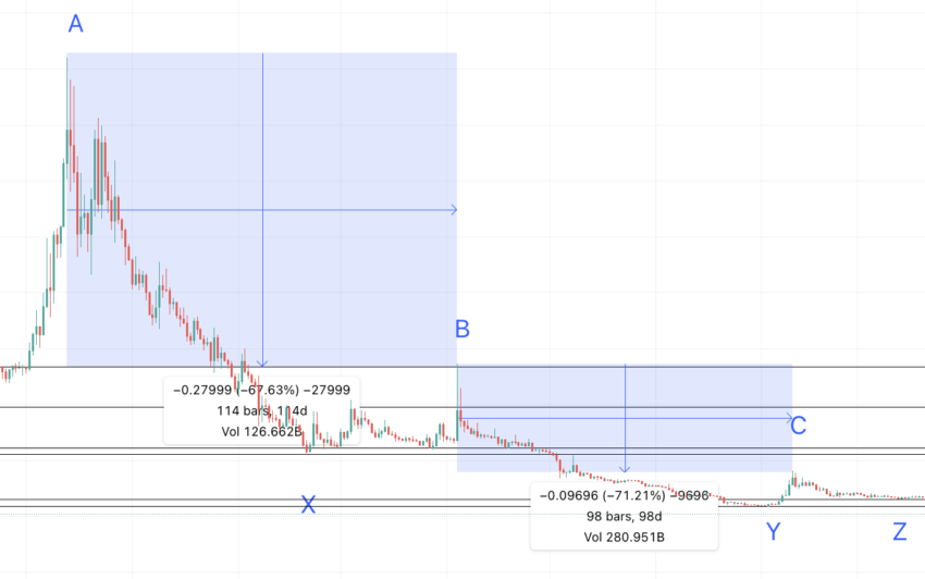 Dengan begitu, titik selanjutnya, yakni C, berada dalam 169 hari dari Y dan setinggi 253,33%. Garis prediksi yang disimpulkan menempatkannya pada US$0,0073 dan pada 7 Juni 2023.