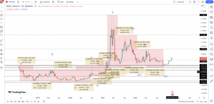 Kita bisa menandai level ini sebagai B1. Kemudian, level terendah selanjutnya atau M1 dapat mencapai level penurunan terendah sebesar 51,32%, karena divergence RSI mingguan positif dapat menghentikan penurunan harga TRX di bawah level tertentu. Dengan demikian, harga minimum TRX pada tahun 2023 diperkirakan mencapai level US$0,0395.