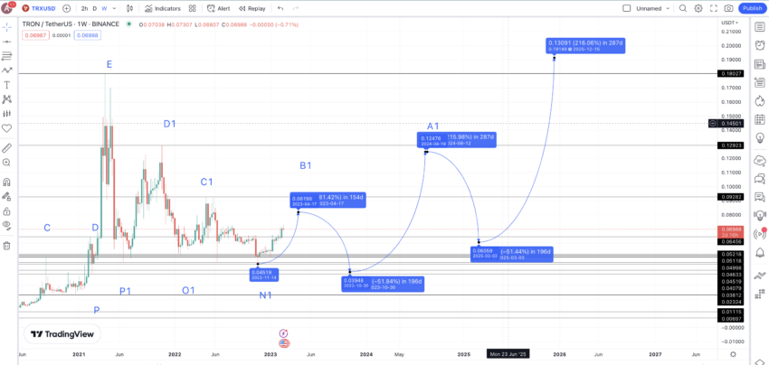 Analisis teknikal jangka pendek kami menunjukkan bahwa TRX punya peluang untuk mengalami konsolidasi cepat. Oleh karena itu, dari titik terendah N1 terakhir, kita bisa memperkirakan harganya hanya akan naik sebanyak 81,36% lebih tinggi, nilai kenaikan terendah dari tabel di atas.