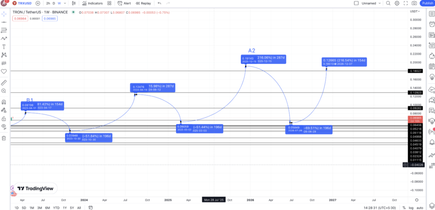 Dari titik terendah ini, pembeli mungkin akan mencoba untuk mendorong harga TRX lebih tinggi lagi, dan membuat pertumbuhan puncak sebesar 216,06% menjadi mungkin. Oleh karena itu, titik tertinggi atau B2 berikutnya, yang harapannya muncul pada tahun 2026 (memakan waktu 150 hari), kemungkinan akan muncul pada level US$0,185.
