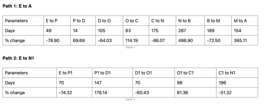 Mengingat bahwa sisi kanan grafik akan terus berkembang sebagai B1, M1, dan A1, kita sekarang akan mencari tahu perubahan harga pada dua jalur: E ke A dan E ke N1.