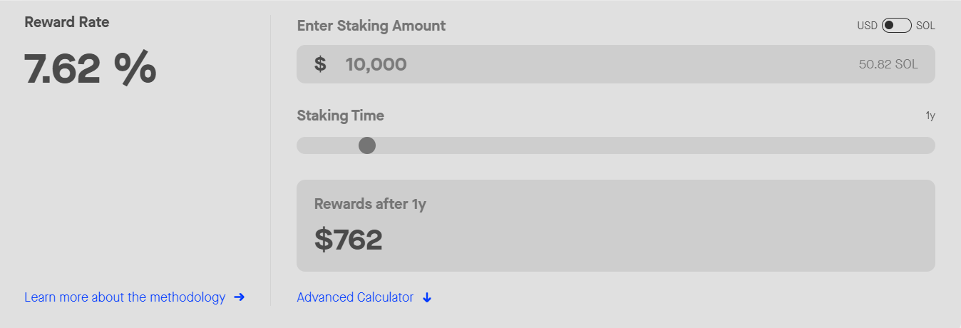 Reward dari staking solana sekitar 7,62% per tahun. Jadi kalau kamu melakukan staking senilai US$10.000 SOL maka kamu bisa mendapatkan US$762 setelah setahun.