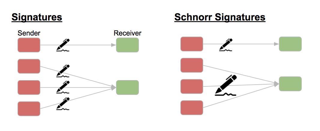 Tanda tangan Schnorr memungkinkan beberapa kunci masuk ke dalam satu transaksi, dengan satu tanda tangan memberdayakannya. Ini berarti bahwa jika banyak pihak masuk, partisipasi mereka tetap rahasia, muncul sebagai satu transaksi. Selain itu, ukurannya lebih kecil daripada tanda tangan Bitcoin tradisional, mengurangi biaya transaksi dan memungkinkan lebih banyak transaksi masuk dalam setiap blok. Hal ini menghasilkan validasi blok yang lebih cepat dan peningkatan throughput transaksi.