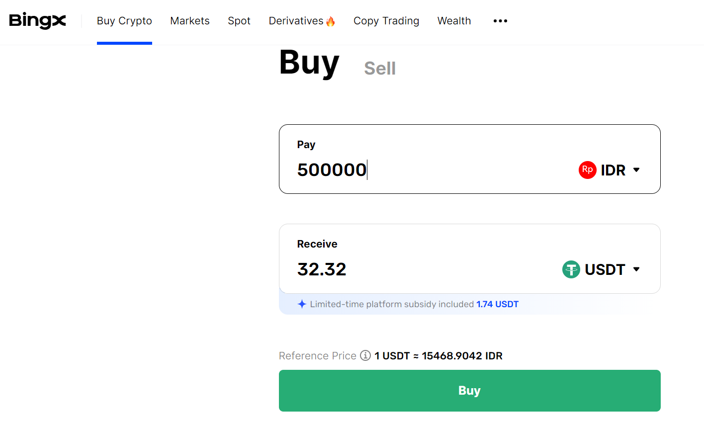 BingX menyediakan tiga metode untuk membeli mata uang kripto dengan mata uang fiat: perdagangan peer-to-peer (P2P), Pembelian Cepat, dan setoran bank.