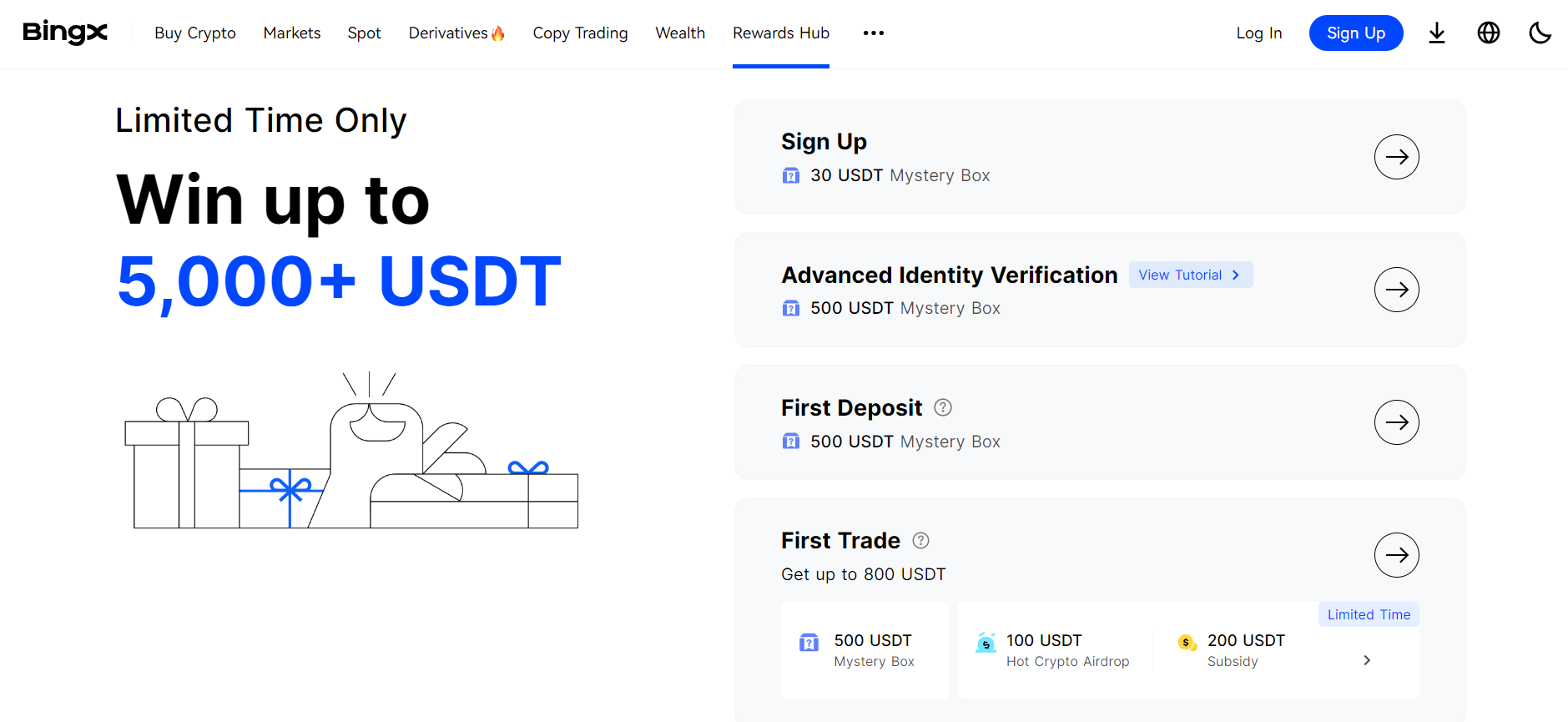 BingX memiliki banyak hadiah di bagian Rewards Hub, yang memang sengaja ada untuk memberikan insentif dan penghargaan kepada pengguna atas keterlibatan dan aktivitas perdagangan mereka. Pengguna dapat memperoleh berbagai hadiah dengan berpartisipasi dalam check-in harian, menyelesaikan tugas perdagangan, dan terlibat dalam aktivitas media sosial. Rewards Hub menawarkan berbagai jenis hadiah sebagai imbalan atas partisipasi pengguna. Ini termasuk: