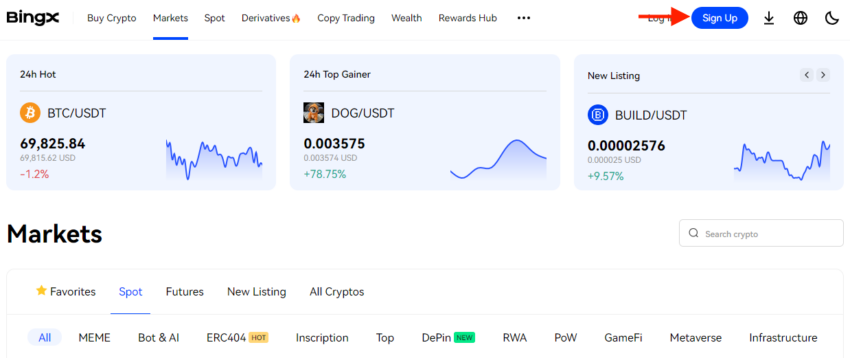 - Navigasi ke BingX: Buka Situs Web BingX. Kamu akan melihat beberapa tab di bagian atas layar. Arahkan ke pojok kanan atas dan cari tombol oval biru bertuliskan “Get Started.” Tekan tombol untuk melanjutkan.