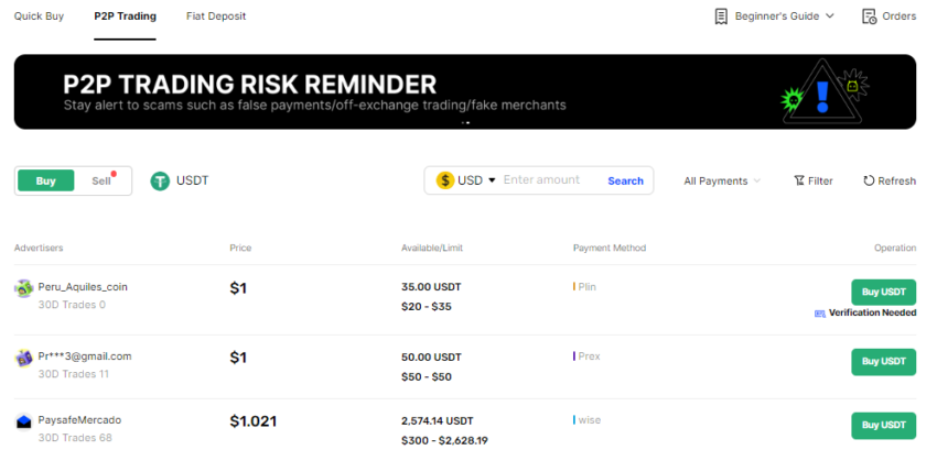 Quick Buy adalah penawaran langsung. Fitur ini memungkinkan pengguna membeli USDT, BTC, atau ETH dengan lebih dari 70 mata uang fiat yang berbeda. Rahasianya, menggunakan pedagang P2P untuk memfasilitasi transaksi Pembelian Cepat.