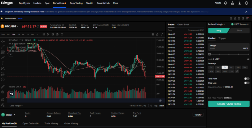 BingX memungkinkan pengguna untuk memperdagangkan kontrak spot dan berjangka. Kamu juga dapat memanfaatkan fitur copy trading dan bot grid trading untuk meningkatkan peluang kesuksesan trading. BingX juga memiliki antarmuka perdagangan lanjutan standar untuk dimanfaatkan pengguna.