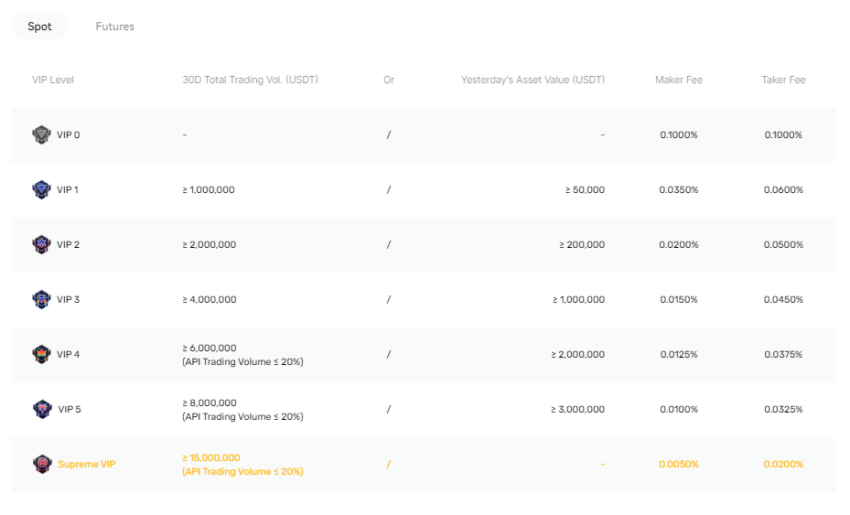 Namun, platform ini juga menawarkan jadwal biaya berjenjang yang regresif. Dengan kata lain, semakin tinggi volume perdagangan 30 hari, semakin rendah biaya perdagangan spot. Untuk anggota VIP, biaya perdagangan bisa serendah 0,005% pembuat dan 0,02% taker.