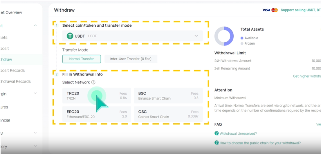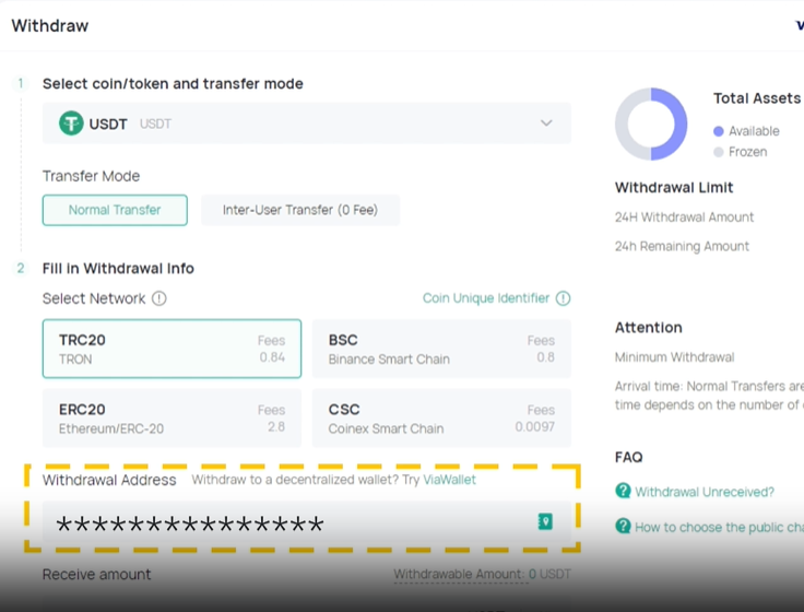 Cara menarik crypto dari CoinEx juga mudah, kamu bisa mengaksesnya dari menu Assets.
