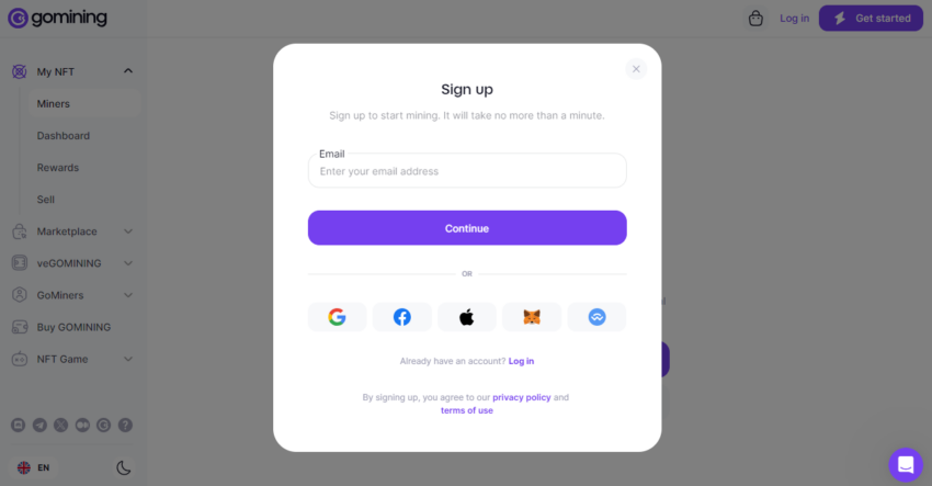 1. Kunjungi situs web GoMining dan masukkan alamat email Anda untuk membuat akun.