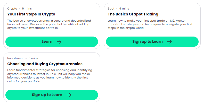Di M2, penghasilan tidak berhenti dengan paket Earn atau bonus selamat datang. Saat Anda memanfaatkan fitur Learn to Earn, Anda dapat mendulang reward sambil belajar tentang kripto, trading, dan investasi. Produk ini menawarkan edukasi dalam tiga inti: