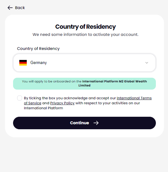 5. Masukkan negara tempat tinggal Anda: Seperti yang disebutkan sebelumnya, M2 tersedia di lebih dari 150 negara. Anda perlu memasukkan negara tempat tinggal Anda, karena beberapa wilayah tidak didukung.