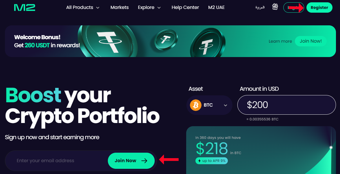 1. Buka situs web resmi M2. Di beranda, Anda akan melihat dua tombol untuk mendaftar. Klik “Daftar” untuk melanjutkan.