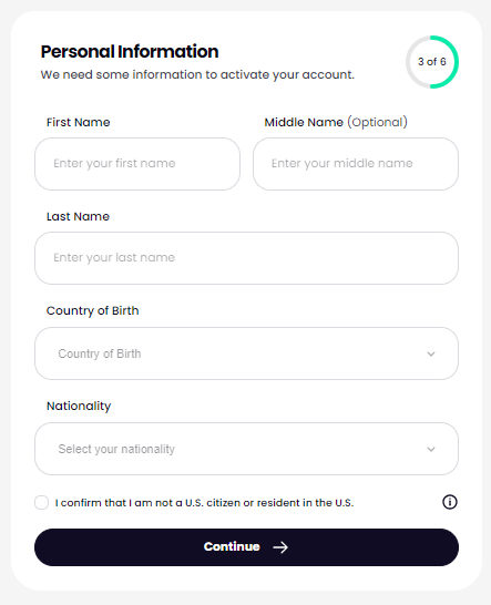 6. Isi informasi pribadi Anda: Untuk melanjutkan proses pendaftaran, Anda harus memasukkan informasi pribadi Anda. Cukup isi nama, negara kelahiran, dan kewarganegaraan Anda. Anda juga harus mengonfirmasi bahwa Anda bukan penduduk atau warga negara AS.
