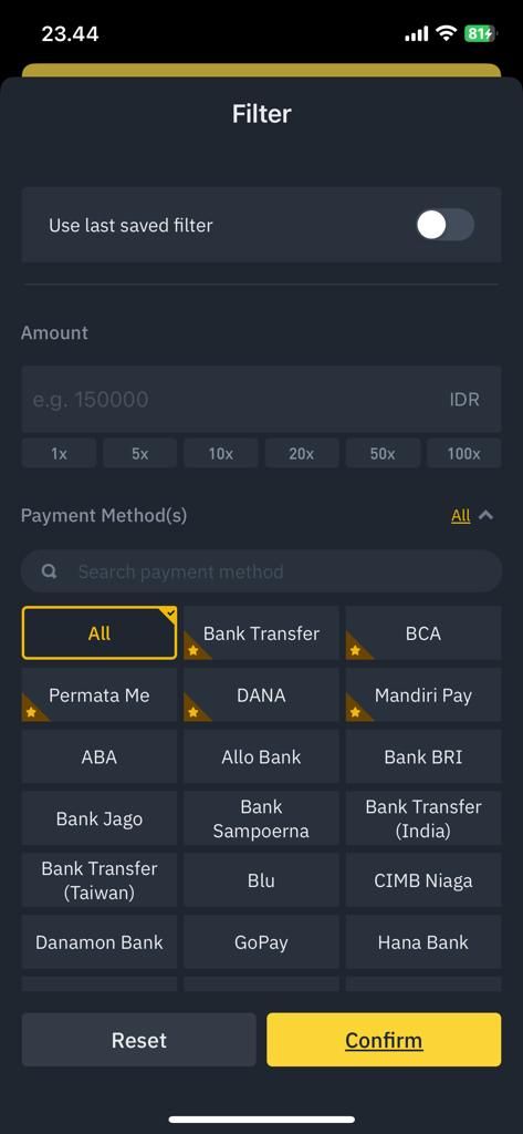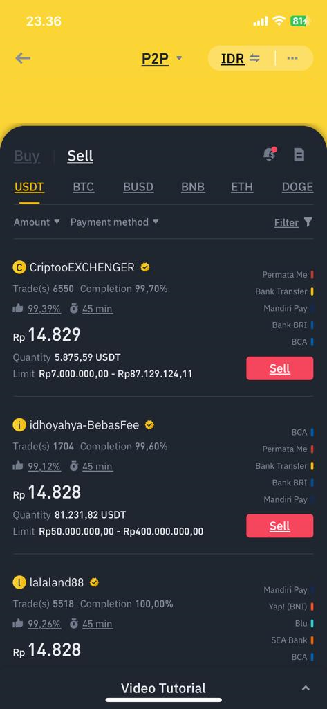 - Pilih advertiser (pembeli) atau P2P merchant sesuai dengan jumlah batasan yang ingin kamu jual. Selain itu, lihat juga metode pembayaran yang tersedia dengan fitur Filter. Paling penting, lihat completion rate atau tingkat keberhasilan transaksi, paling tinggi palik baik. Lalu klik Jual.