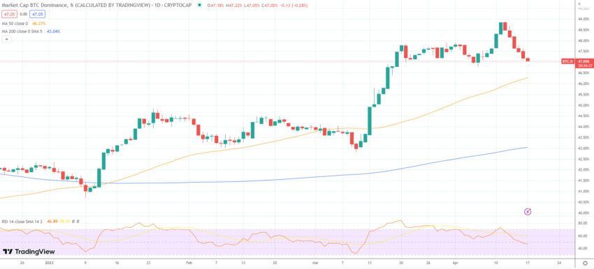 Kemudian, Skew juga mengamati bahwa Bitcoin Dominance mulai menurun. Menurut TradingView, BTC Dominance telah turun hampir 4% dalam waktu kurang dari seminggu terakhir. Penurunan ini disebabkan oleh naiknya harga Ethereum setelah upgrade Shapella yang sukses terlaksana pada tanggal 12 April lalu.