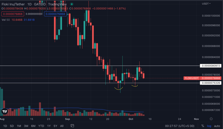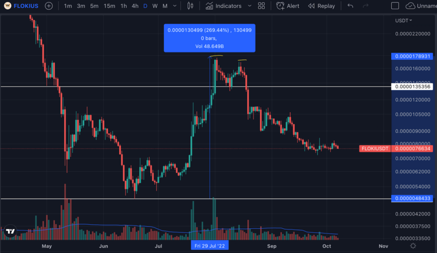 Pada bulan Juni 2022 lalu, koin ini sempat anjlok ke titik terendahnya di sekitar level 0,0000048433. Setelah itu, FLOKI melangsungkan reli bombastis dan berhasil naik 270%, dan mencetak titik tertinggi lokal baru di sekitar level 0,0000178931. Namun, FLOKI akhirnya membentuk double top dan amblas di bawah neckline pada level 0,0000135356. Akibatnya sejak itu, harganya terus mengalami penurunan dan akhirnya anjlok hampir 55% dari titik tertingginya di bulan Agustus.