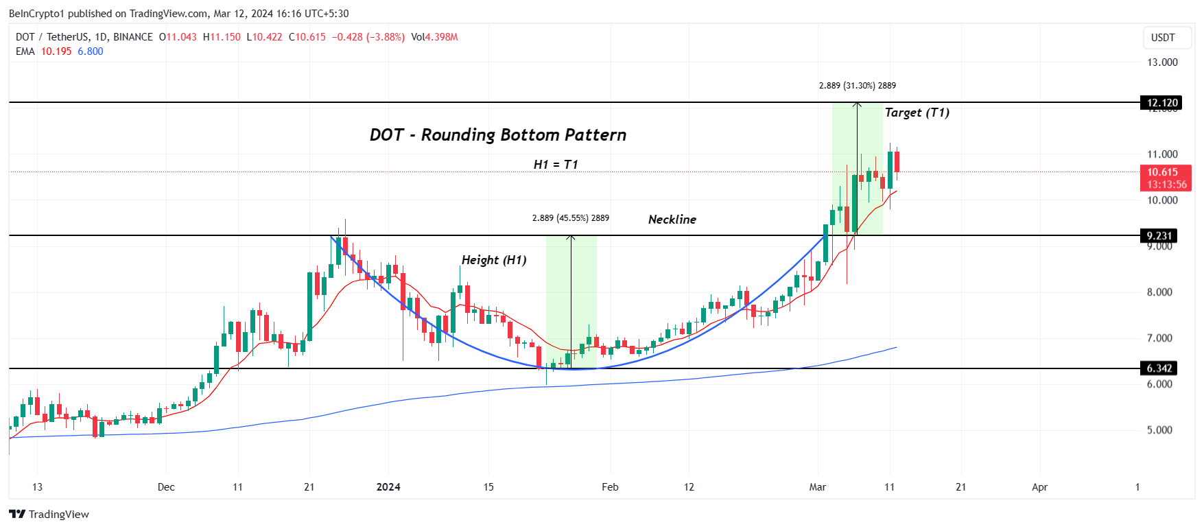 Harga Polkadot telah menunjukkan pola rounding bottom selama beberapa minggu terakhir. Sejak awal tahun, pola bullish reversal ini sudah terbentuk, menembus garis neckline di awal bulan.
