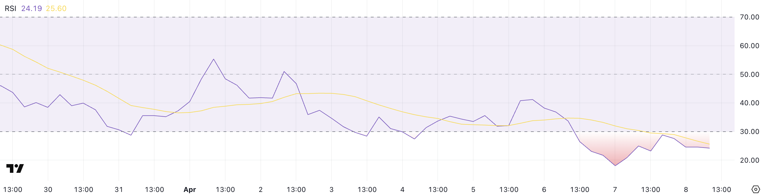 RSI (Relative Strength Index) Berachain saat ini berada di 24,19, tetap di bawah ambang oversold 30 sejak kemarin.