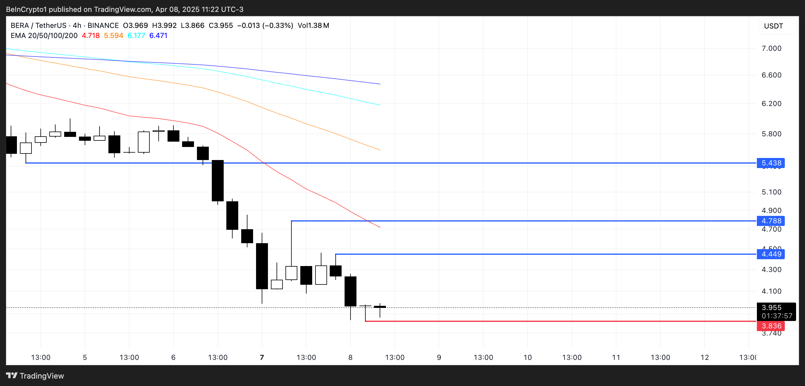 Pengaturan EMA juga menunjukkan potensi penurunan lanjutan, meningkatkan risiko bahwa BERA bisa jatuh di bawah US$3,80 dan mencapai titik terendah baru sepanjang masa. Namun, jika bull berhasil masuk, level resistance kunci di US$4,44 dan US$4,78 bisa menjadi target, membuka peluang untuk pemulihan potensial.