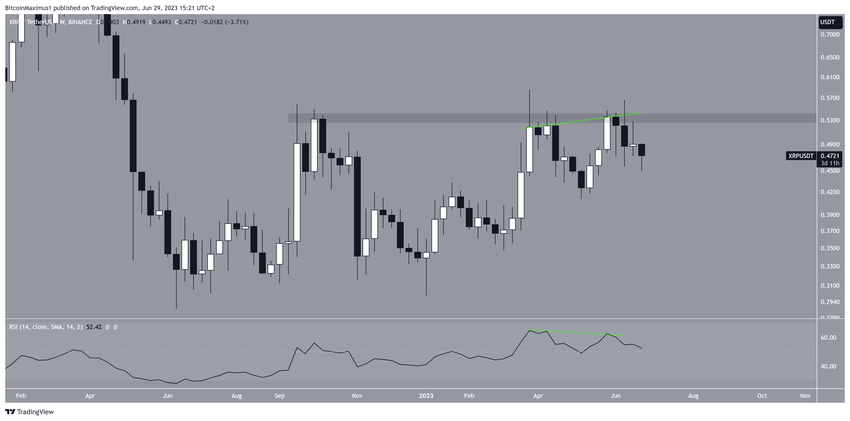 Sejak September 2022, harga XRP sudah tiga kali berupaya untuk melewati level resistance jangka panjang di US$0,53. Namun, sayangnya, upaya tersebut gagal. Karena sudah berada di sana dalam waktu yang cukup lama, maka area tersebut pun menjadi resistance yang krusial. Maka dari itu, breakout di atas area tersebut akan sangat mempercepat laju kenaikannya.