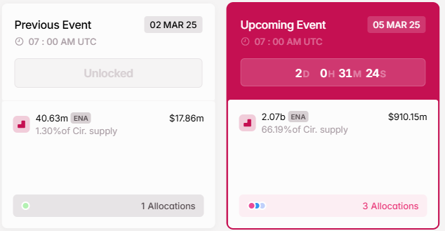 Token unlock ENA juga masuk daam deret berita kripto utama minggu ini. Mengacu pada jadwal, gelaran tersebut akan berjalan pada 5 Maret. Pada hari Rabu, jaringan Ethena akan membuka 2,07 miliar token ENA, yang merupakan 66,19% dari pasokan yang beredar dan bernilai US$910,15 juta pada harga saat ini.