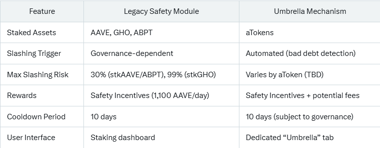 Ini akan meningkatkan keamanan protokol, efisiensi modal, dan pengalaman pengguna. Umbrella beralih ke staking aTokens, token penerimaan Aave yang mewakili aset yang disuplai dalam pool likuiditas. Ini berbeda dengan Safety Module sebelumnya, yang memungkinkan staking AAVE, GHO, dan AAVE/WETH Balancer Pool Tokens (ABPT).