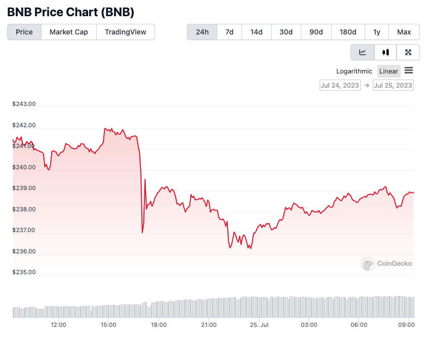 SponsoredBerdasarkan data CoinGecko, harga native token Binance, yaitu BNB, kini berada di level US$238 atau naik sekitar 0,3%. Di samping itu, harga BNB turun sekitar 1% dalam 24 jam terakhir dan turun sekitar 3% dalam 7 hari terakhir.