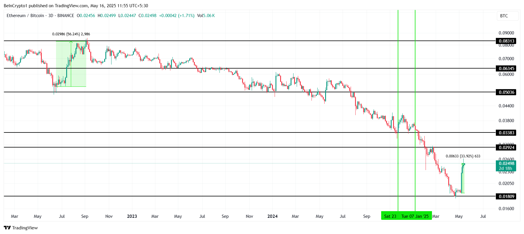 Pertama kali sejak Desember 2024, pasangan ETH/BTC mencatat breakout. Untuk pertama kalinya dalam lima bulan, pasangan ini mencatatkan higher low, yang umumnya dianggap sebagai tanda tren naik. Breakout ini signifikan, menandai kenaikan 34% hanya dalam satu minggu.